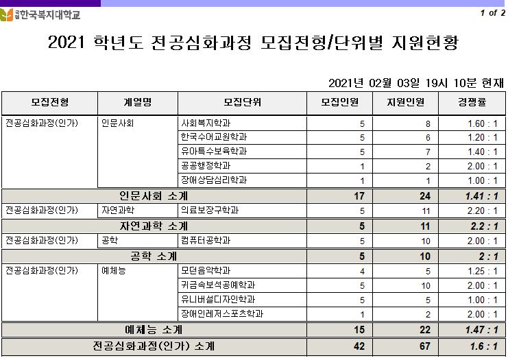| 제목 | 2021학년도 전공심화과정 모집전형별 지원현황(현재기준) 안내(2.3. 19시) 최종 | ||||