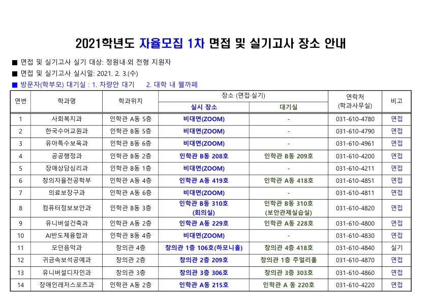 | 제목 | 자율모집 1차 면접 및 실기시험 장소 안내 | ||||